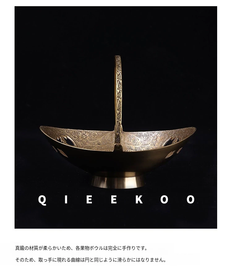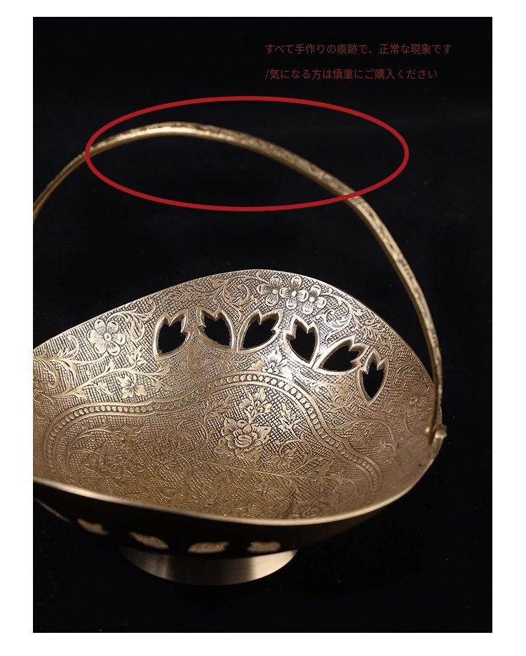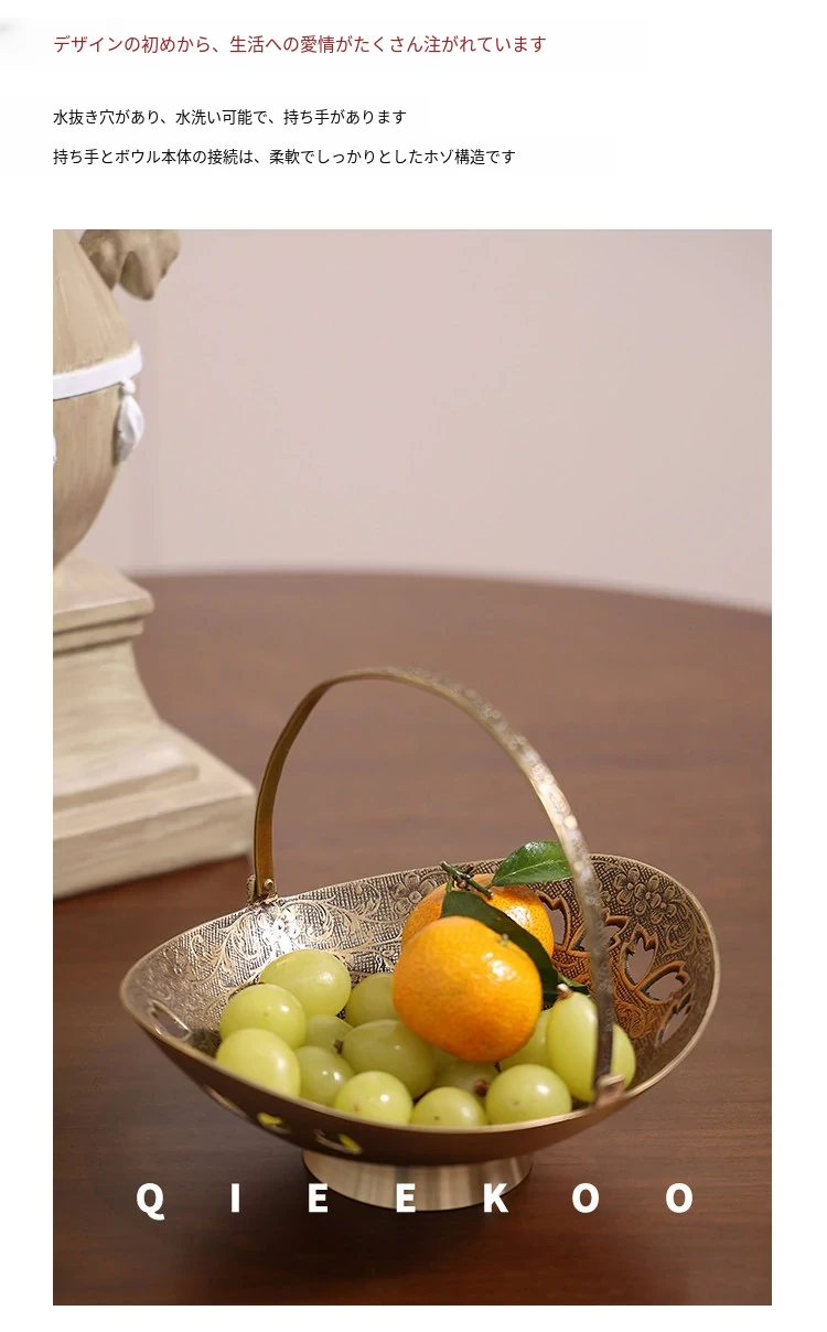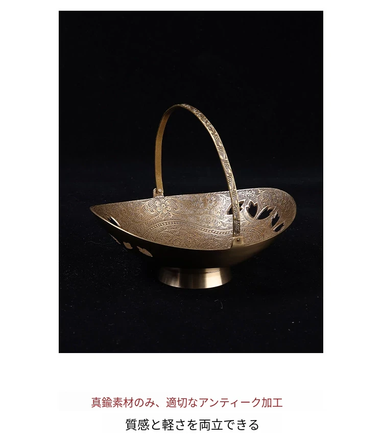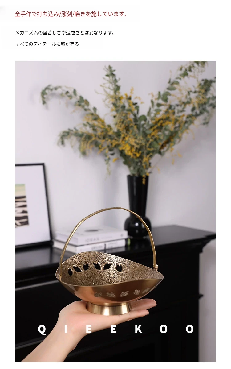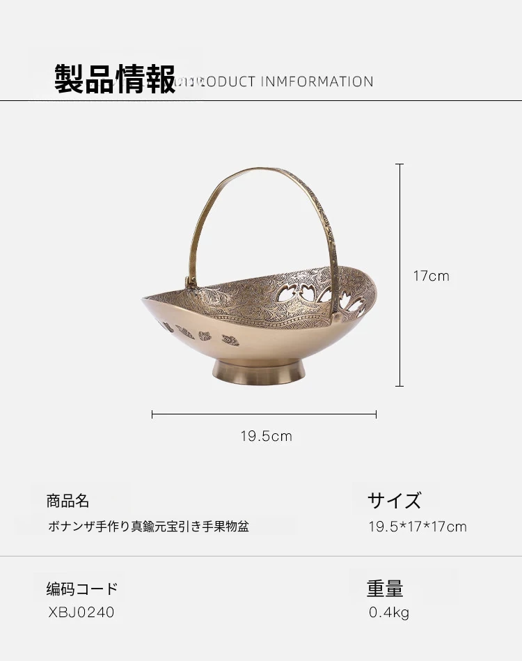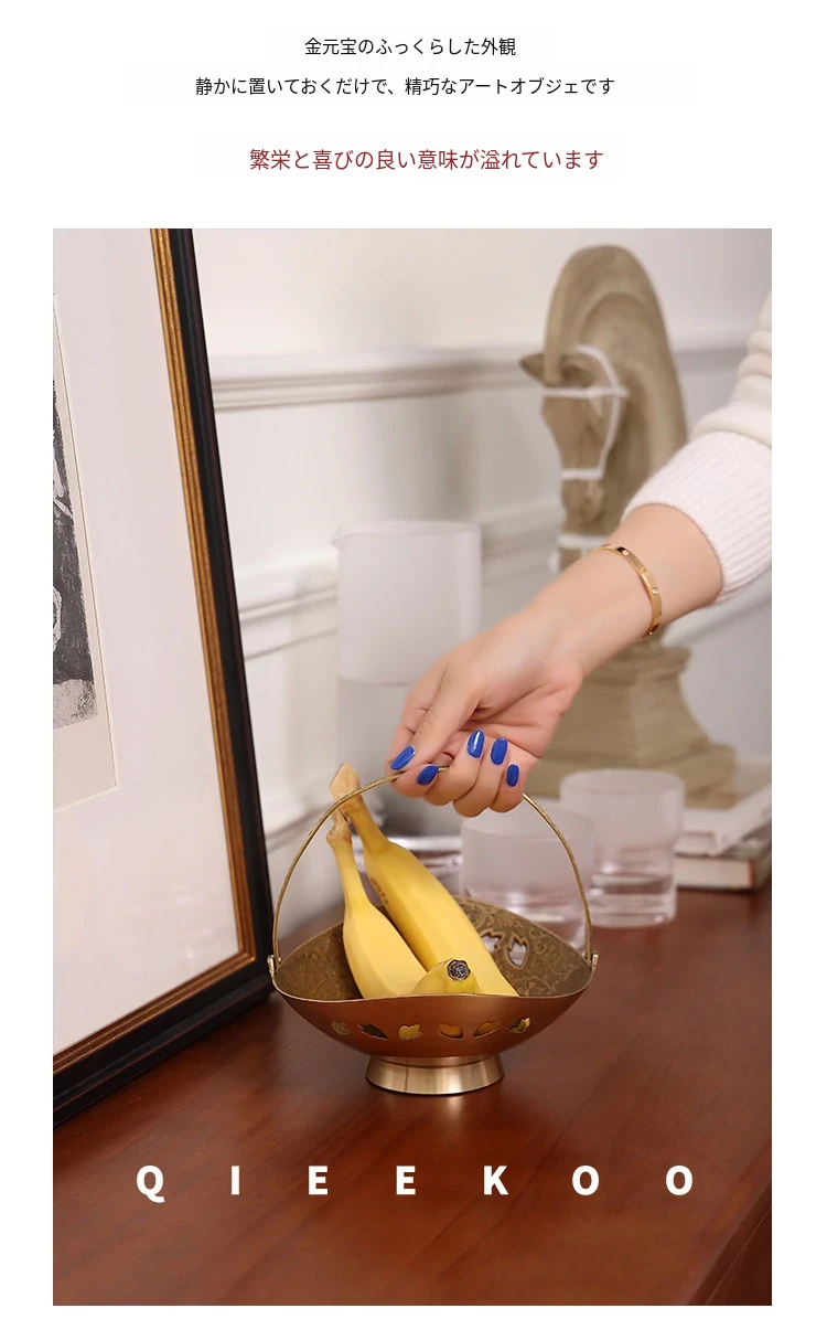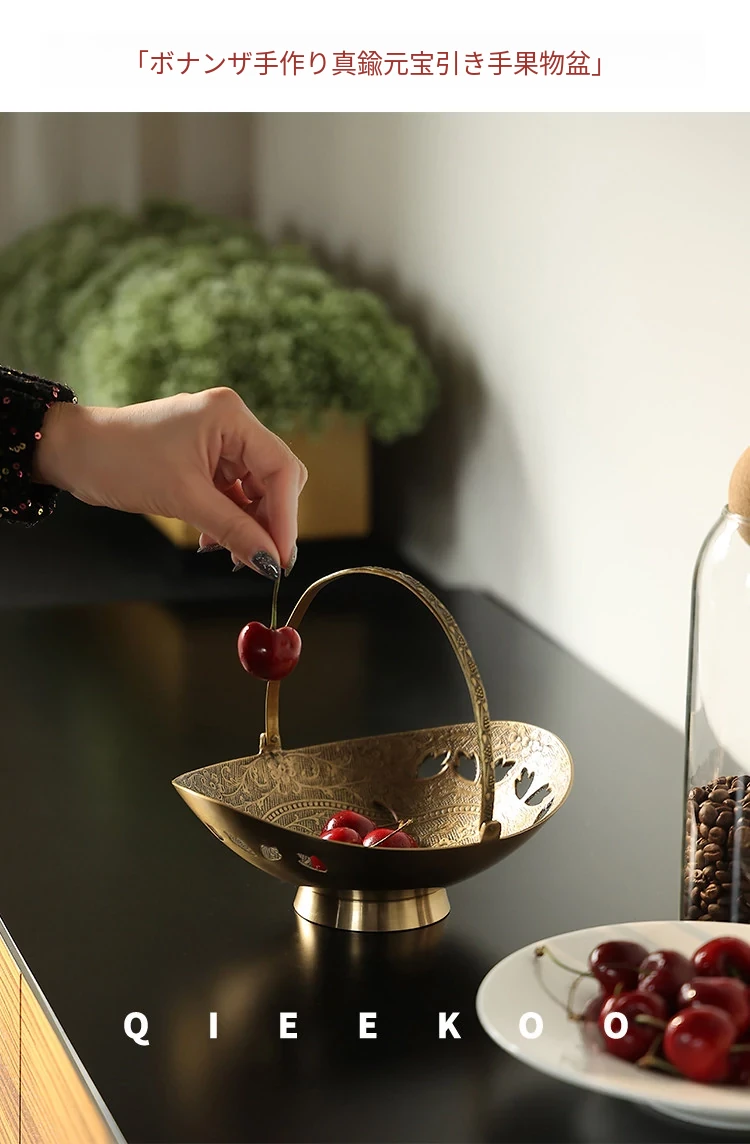 契阔家居の輸入デザイン手作り真鍮元宝型ハンドル付き果物バスケット収納トレー、心を込めたデスクアクセサリーとして最適!あなたのインテリアに華やかさをプラスします。