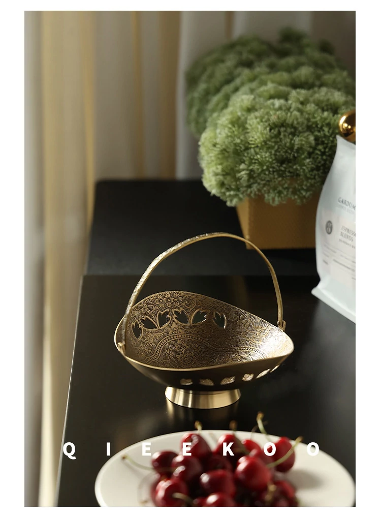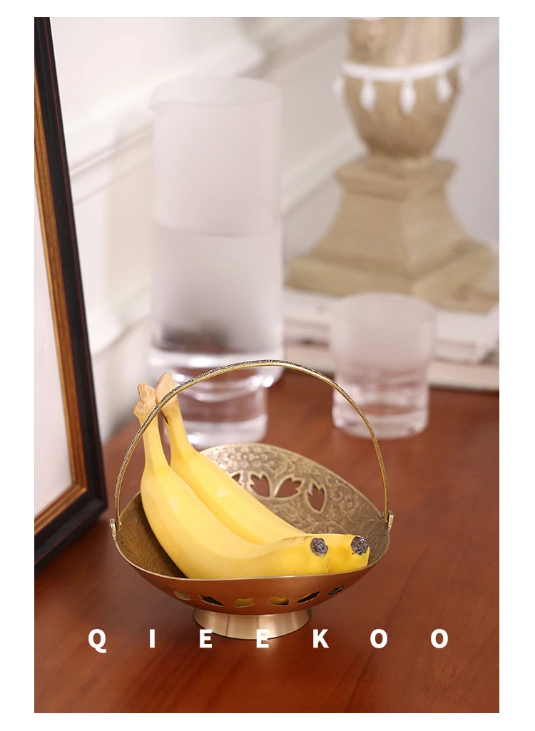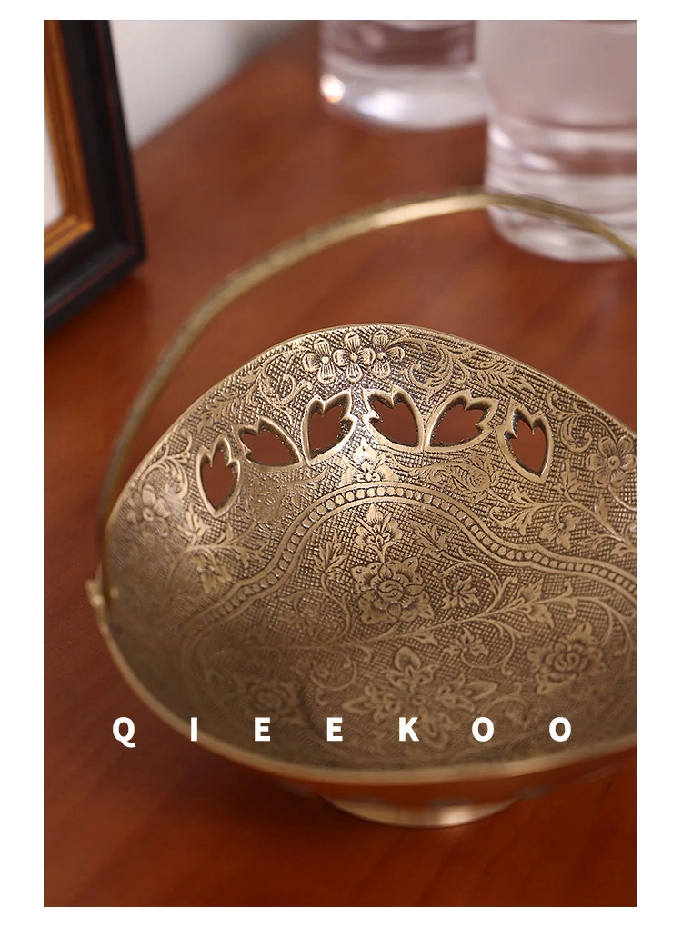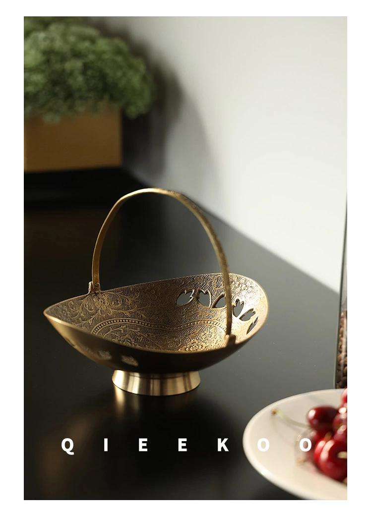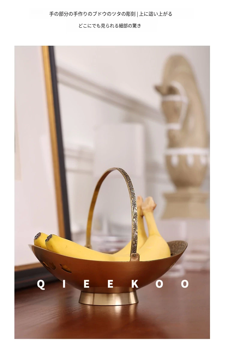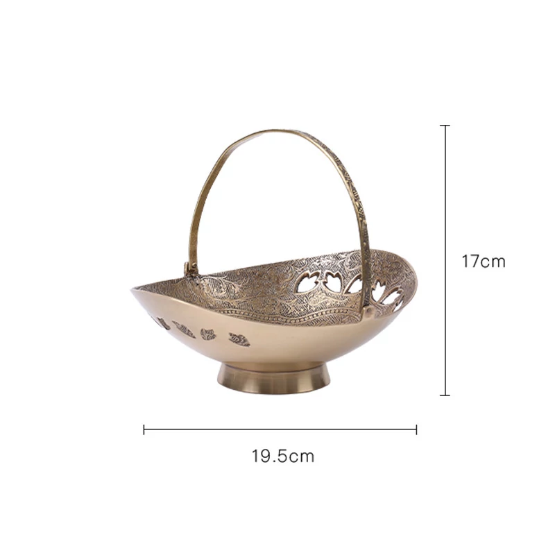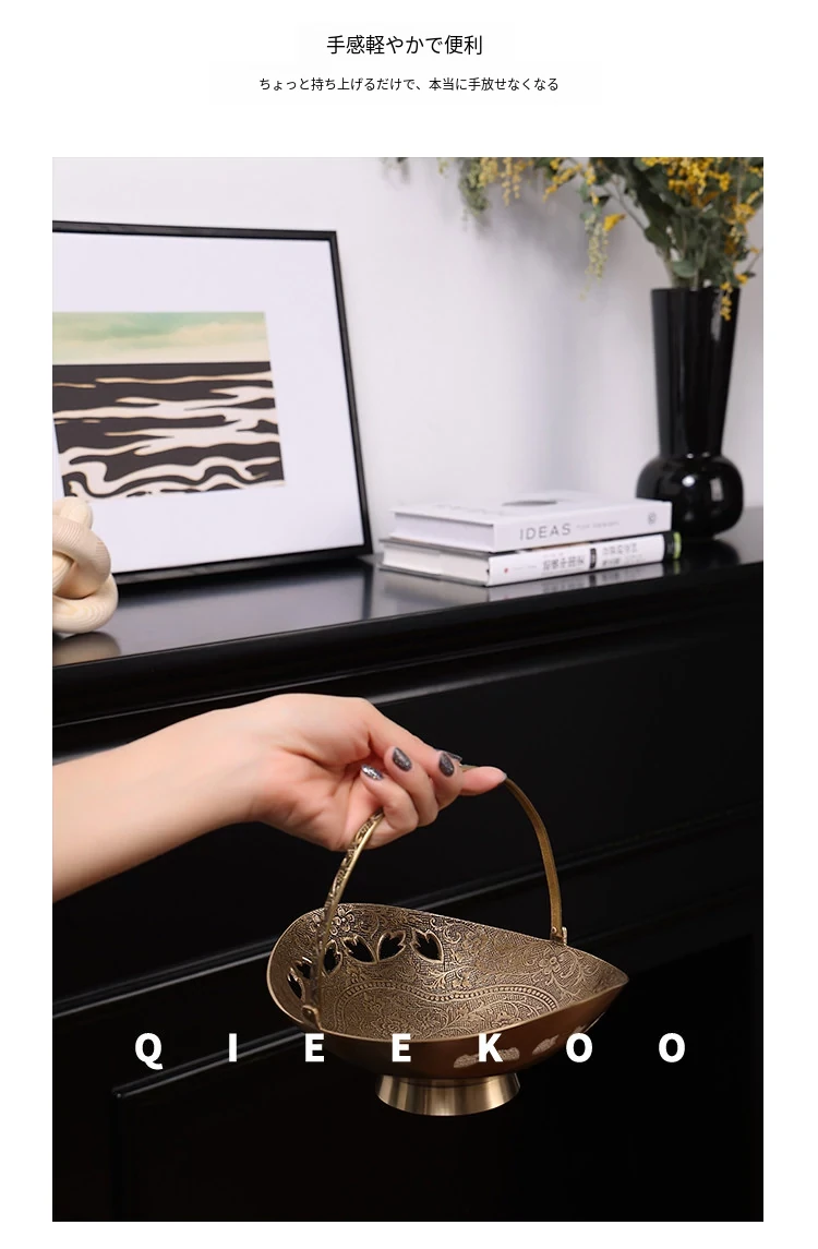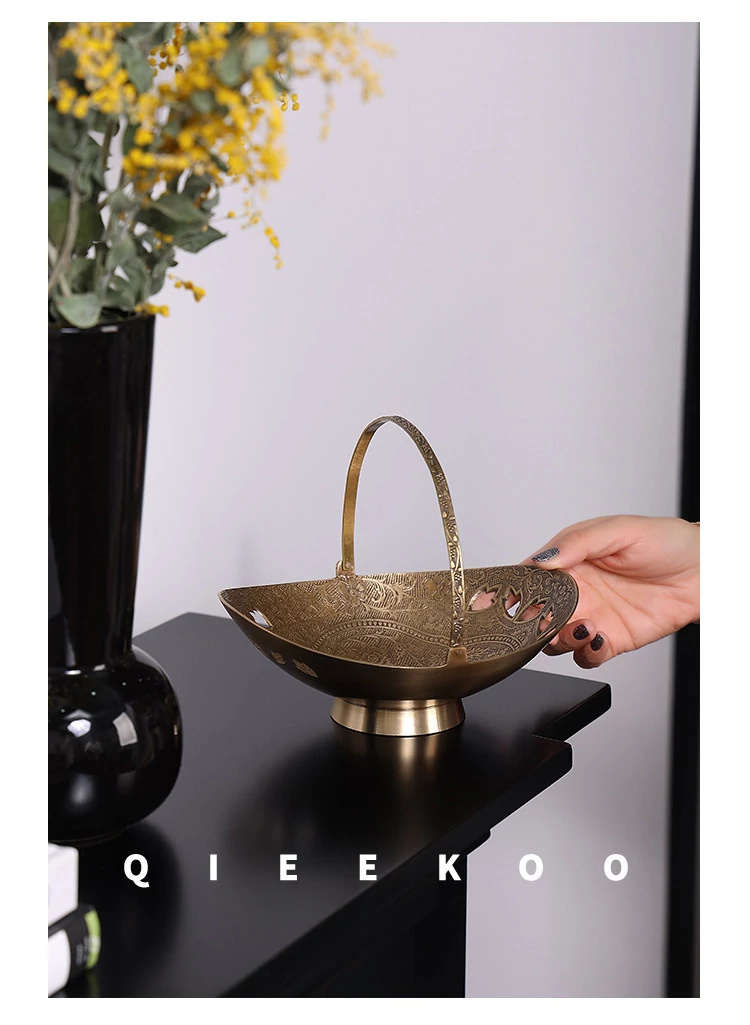契阔家居の輸入デザイン手作り真鍮元宝型ハンドル付き果物バスケット収納トレー、心を込めたデスクアクセサリーとして最適!あなたのインテリアに華やかさをプラスします。