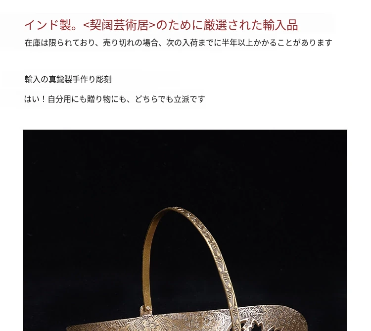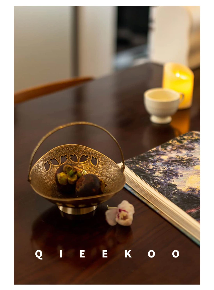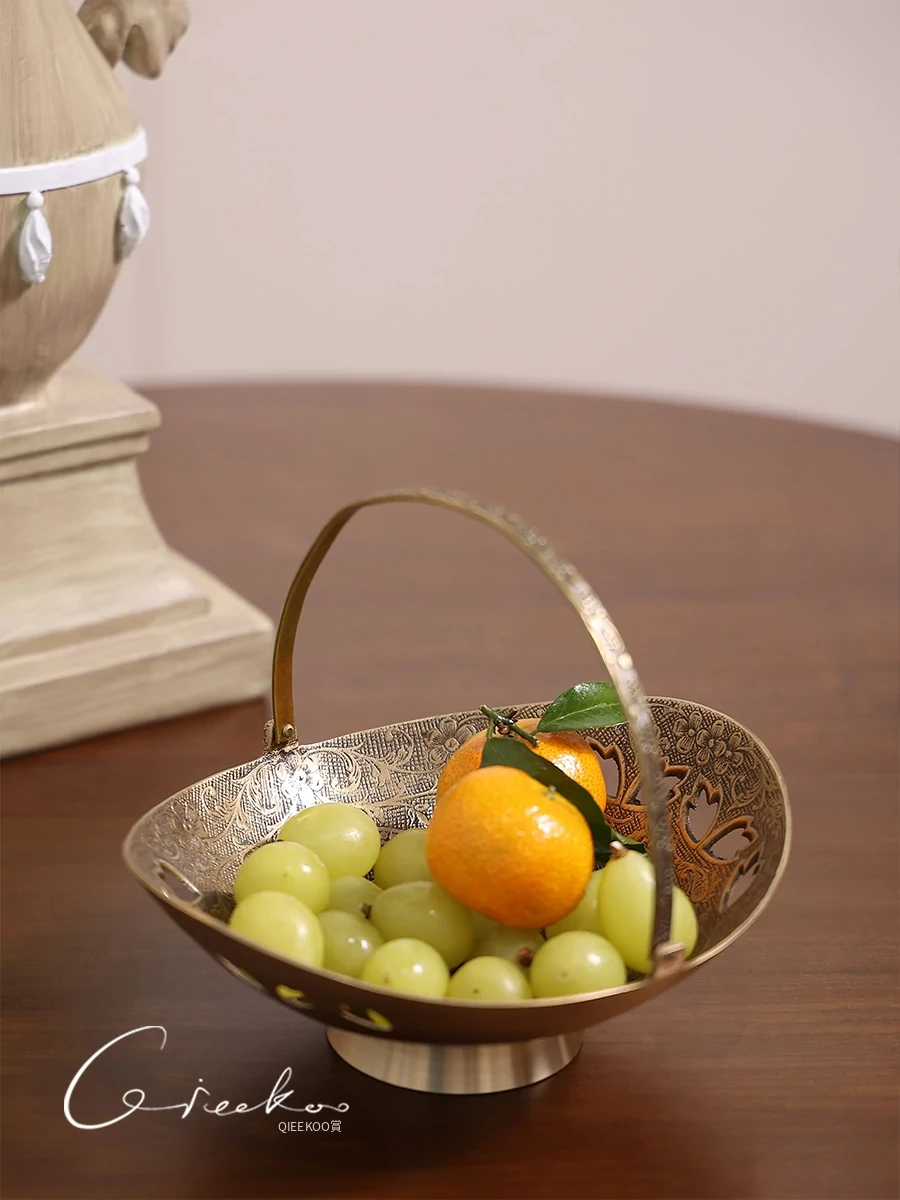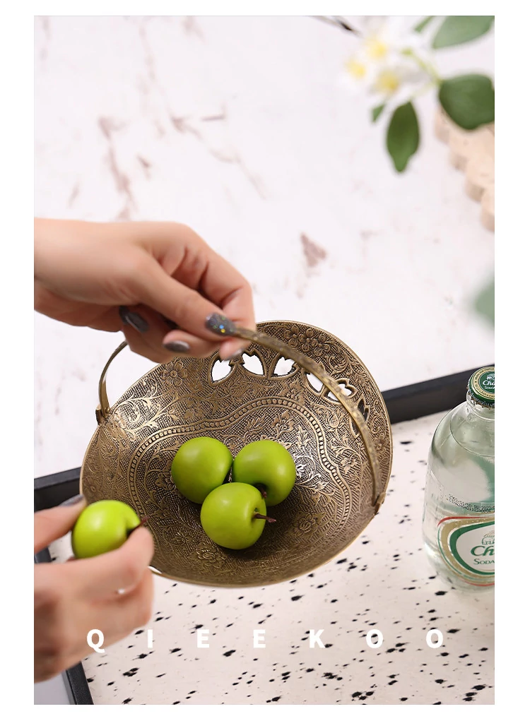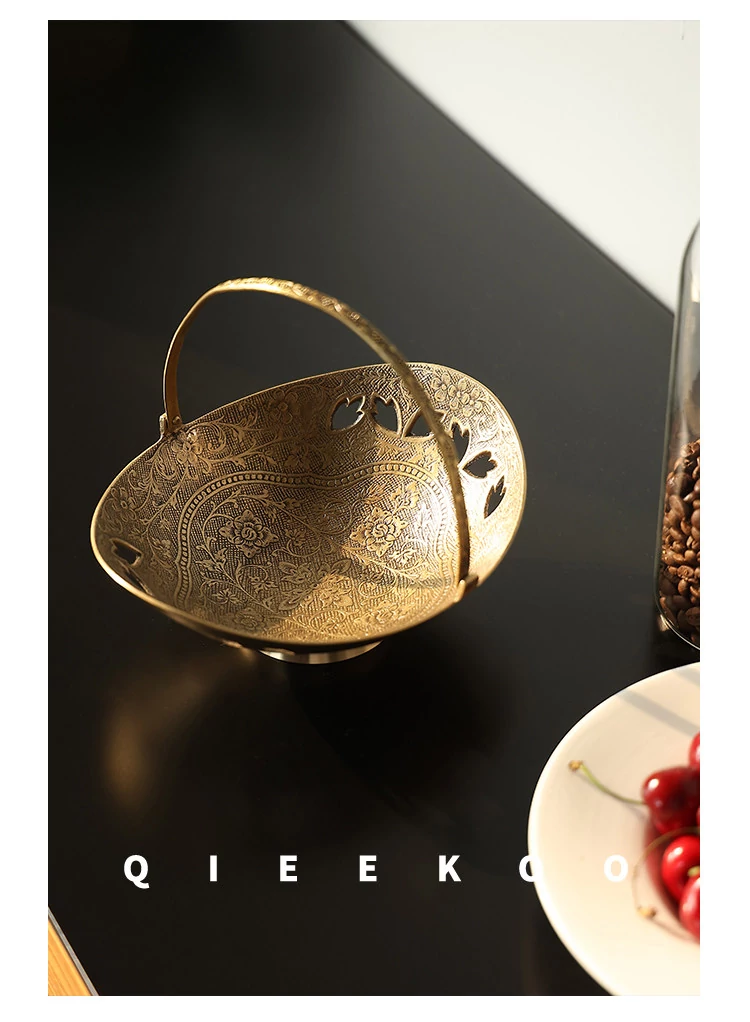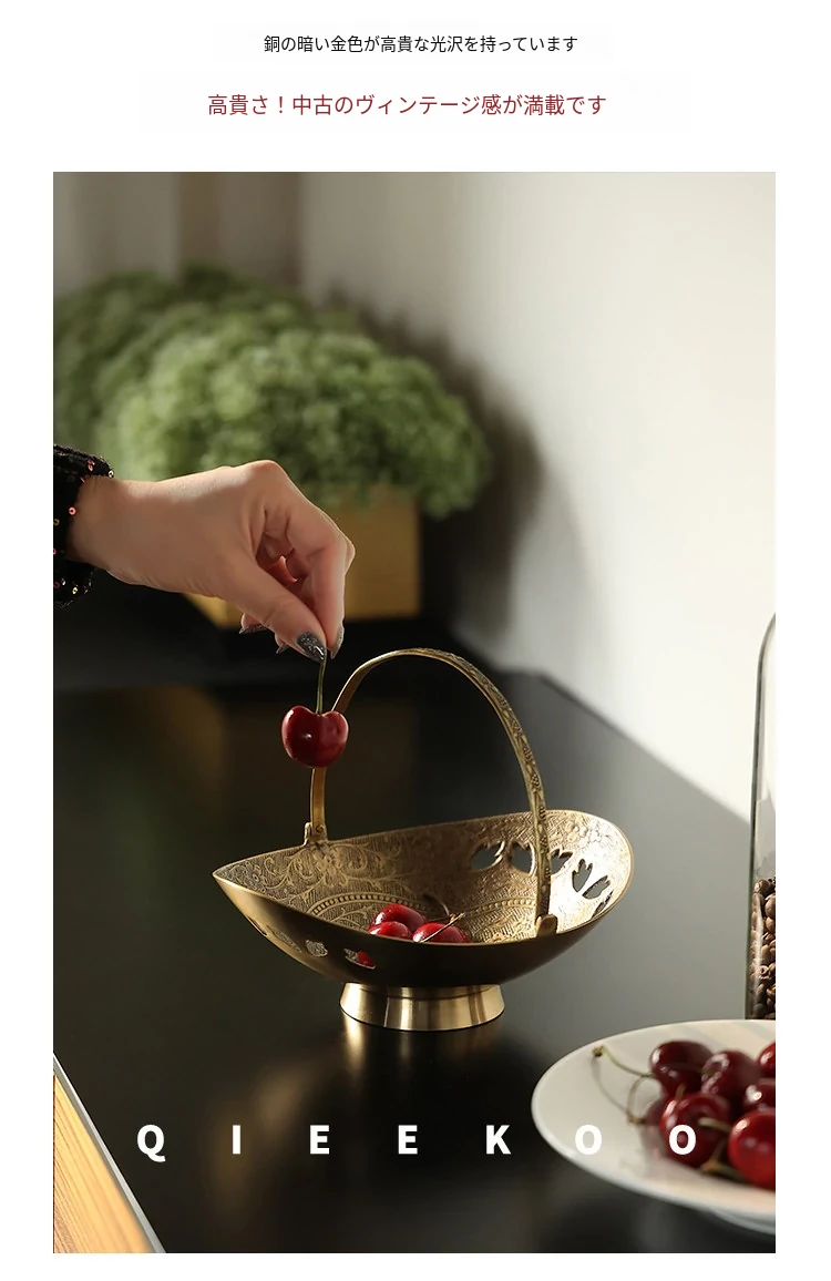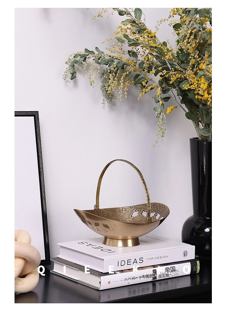 契阔家居の輸入デザイン手作り真鍮元宝型ハンドル付き果物バスケット収納トレー、心を込めたデスクアクセサリーとして最適!あなたのインテリアに華やかさをプラスします。